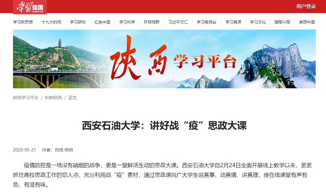 疫情防控是一場沒有硝煙的戰爭,更是一堂鮮活生動的思政大課。西安石油大學自2月24日全面開展線上教學以來,緊緊抓住高校思政工作的切入點,充分利用戰“疫”素材,通過思政課向廣大學生說真事、動真情、講真理,使在線課堂有聲有色、有滋有味。