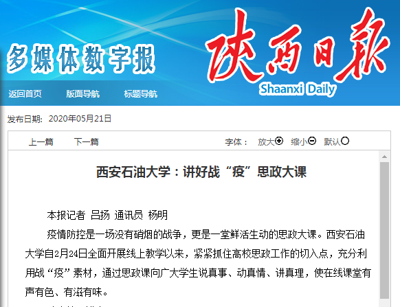 疫情防控是一場沒有硝煙的戰爭,更是一堂鮮活生動的思政大課。西安石油大學自2月24日全面開展線上教學以來,緊緊抓住高校思政工作的切入點,充分利用戰“疫”素材,通過思政課向廣大學生說真事、動真情、講真理,使在線課堂有聲有色、有滋有味。