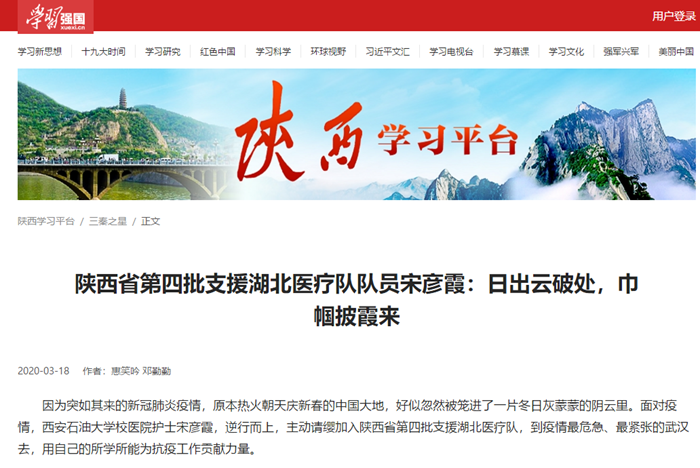 因為突如其來的新冠肺炎疫情,原本熱火朝天慶新春的中國大地,好似忽然被攏進了一片冬日灰蒙蒙的陰云里。面對疫情,西安石油大學校醫院的宋彥霞護士,逆行而上主動請纓加入陜西省第四批援鄂醫療隊,到疫情最危急、最緊張的武漢去,用自己的所學所能為抗疫工作貢獻力量。