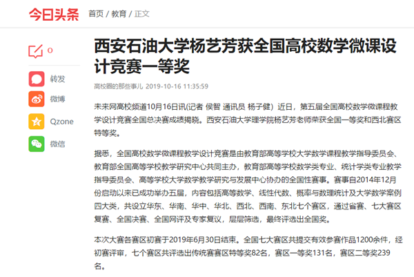 未來網高校頻道10月16日訊(記者 侯智 通訊員 楊子健)近日,第五屆全國高校數學微課程教學設計競賽全國總決賽成績揭曉。西安石油大學理學院楊藝芳老師榮獲全國一等獎和西北賽區特等獎。