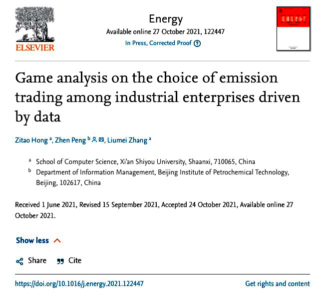 計(jì)算機(jī)學(xué)院電子信息(計(jì)算機(jī)技術(shù))專業(yè)碩士研究生洪子濤同學(xué)、導(dǎo)師張留美副教授和北京石油化工學(xué)院彭珍教授共同合作撰寫的論文《Game analysis on the choice of emission trading among industrial enterprises driven by data》,日前收到國際SCI期刊《Energy》的論文錄用接收函,并已完成對(duì)該論文樣稿的校對(duì),在該期刊網(wǎng)上上線。據(jù)悉,《Energy》是由英國佩加蒙愛思唯爾科學(xué)有限公司出版,是能源動(dòng)力領(lǐng)域國際Top期刊,目前影響因子7.147。在中國科學(xué)院文獻(xiàn)情報(bào)中心期刊分區(qū)表中(2020年12月最新升級(jí)版),屬于一區(qū)刊物。