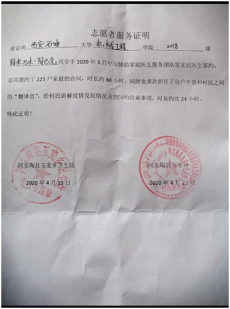 5月份,在不耽誤學(xué)校的網(wǎng)絡(luò)課程的同時(shí),阿米乃木?阿巴克利用課下時(shí)間去當(dāng)?shù)氐拇逦瘯?huì)幫忙,擔(dān)任村民委員會(huì)黨建辦協(xié)管員,準(zhǔn)備黨課資料,整理黨員檔案,錄入智慧黨建系統(tǒng)等工作。在村委會(huì)幫忙的這段日子里,她深深的被身邊各行各業(yè)優(yōu)秀的黨員事跡感動(dòng)著,為了積極向黨組織靠攏,她明確表示回校后將向?qū)W院遞交自己的第一份入黨申請書。