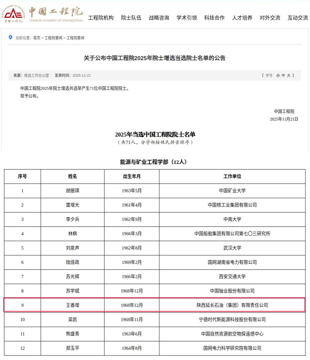11月21日,中國工程院2025年院士增選結(jié)果正式揭曉,共選舉產(chǎn)生71位中國工程院院士,其中,能源與礦業(yè)工程學(xué)部新增院士12人,我校85級校友、碳中和未來技術(shù)研究院院長王香增當(dāng)選。